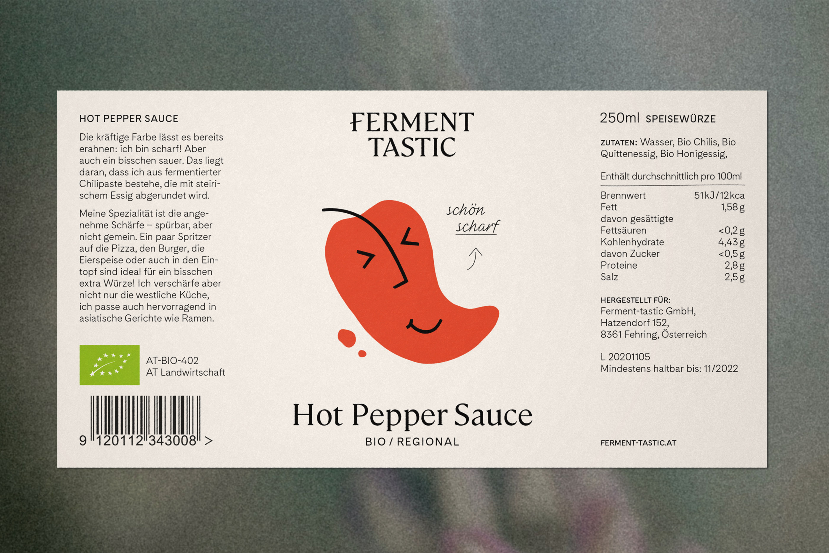 The creators of Ferment-Tastic had the vision of developing a regional and organic condiment. With their innovative range of fermented sauces and seasonings, centred around Austrian Lupin Sauce, they have succeeded in doing just that. The products are designed to bring new flavours to familiar cooking processes. We were asked to develop a brand strategy for Ferment-Tastic and design the brand's visual identity, including the packaging. A key aspect of this was to communicate knowledge about how to use the products, some of which are still unknown. The characters on the labels were developed specifically for this purpose. They help to convey the content in an accessible way, while adding the desired touch of humour and creativity.