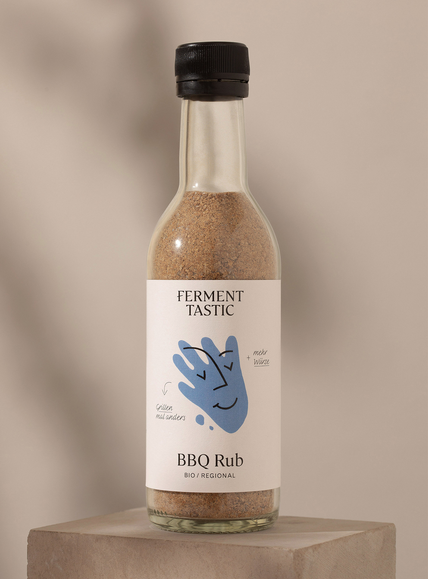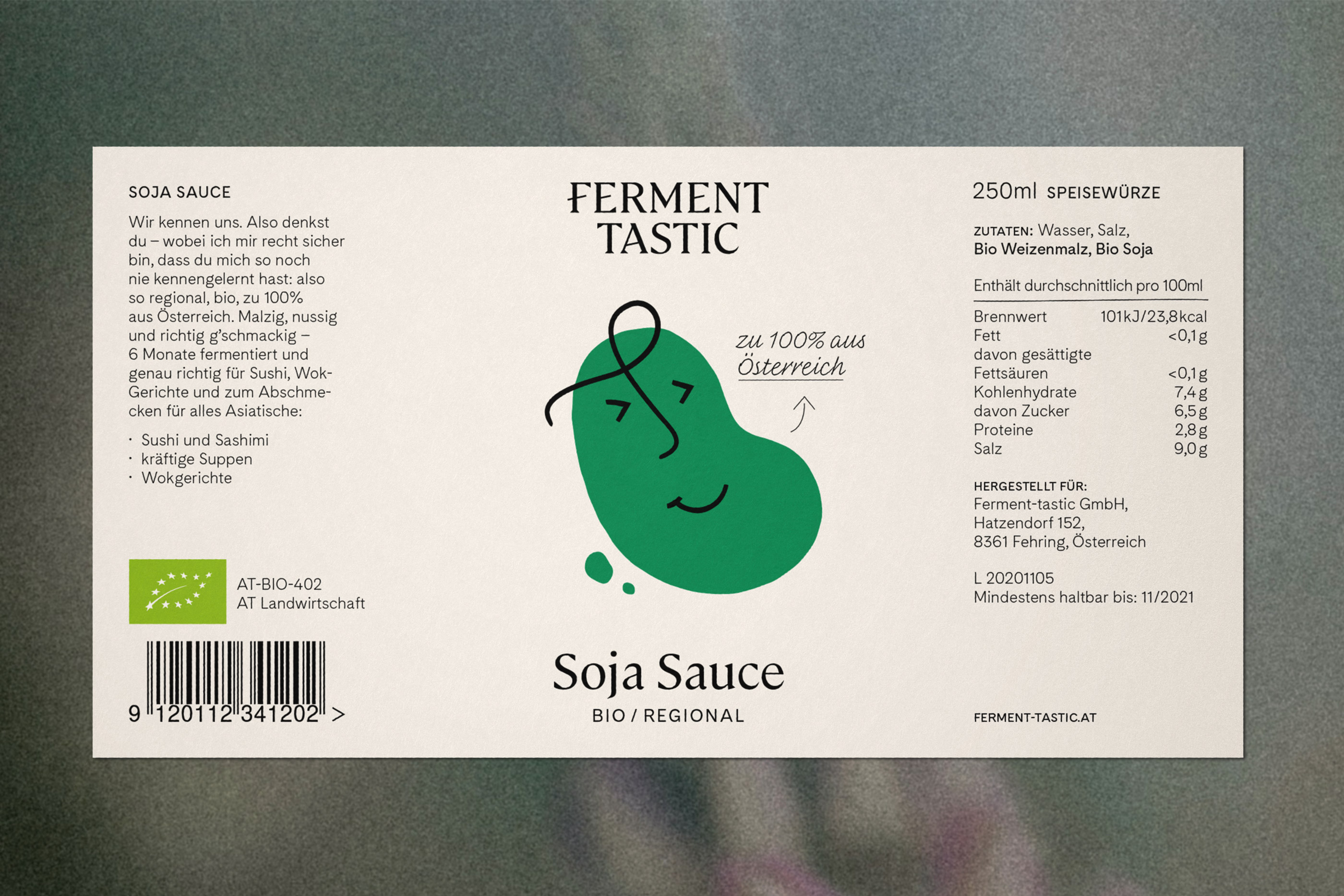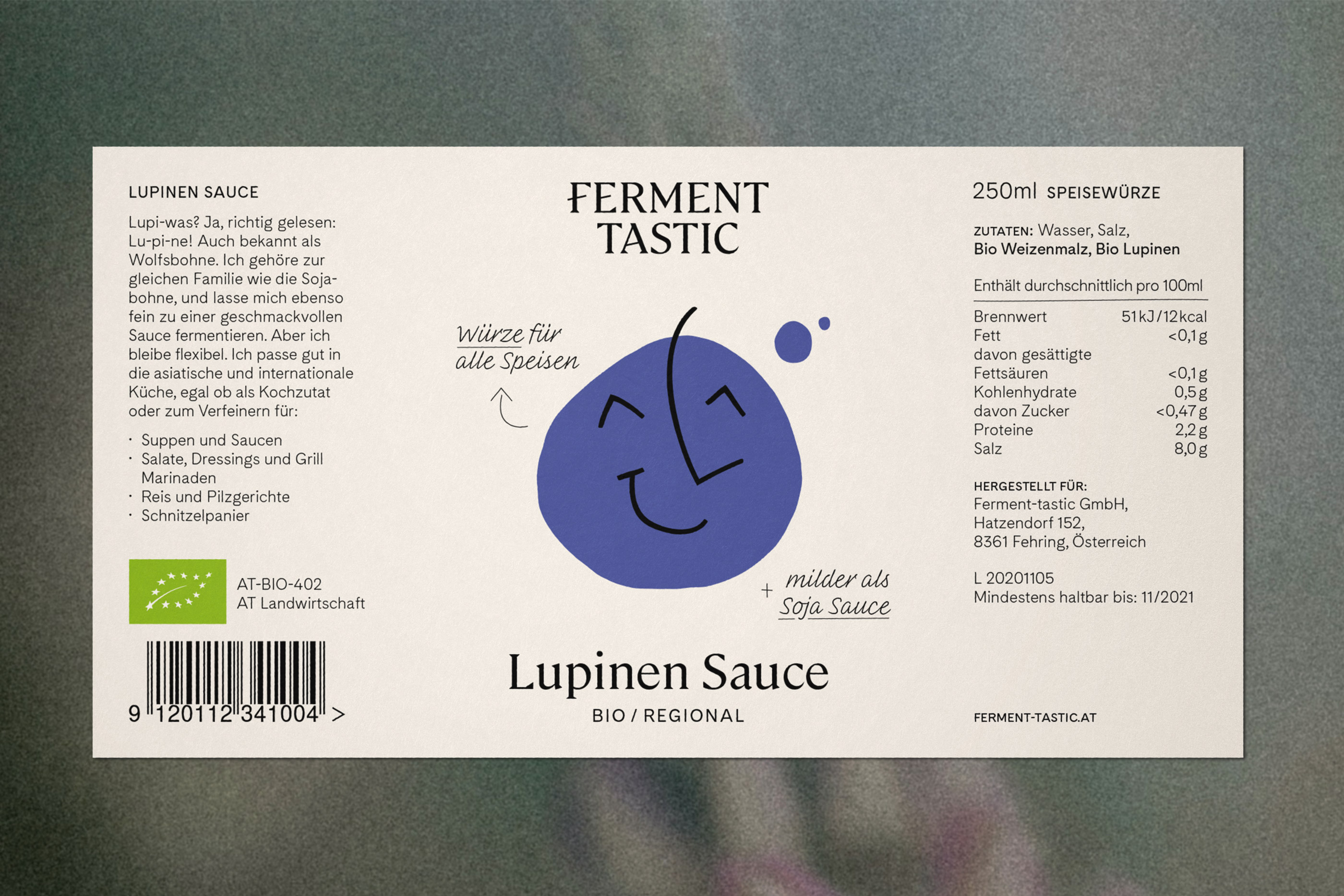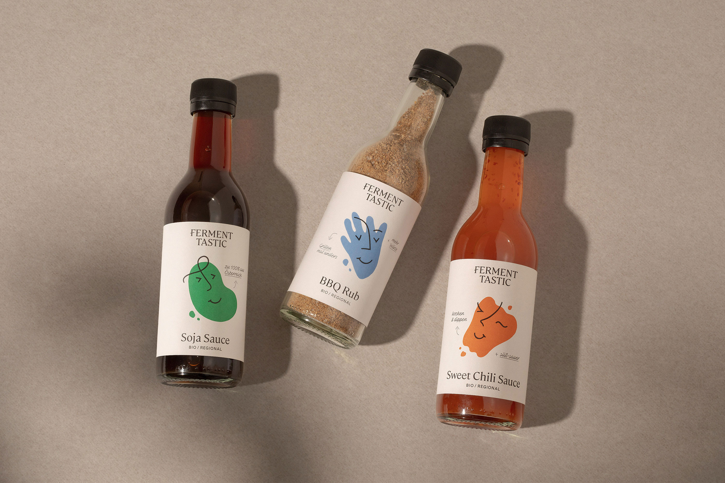 The creators of Ferment-Tastic had the vision of developing a regional and organic condiment. With their innovative range of fermented sauces and seasonings, centred around Austrian Lupin Sauce, they have succeeded in doing just that. The products are designed to bring new flavours to familiar cooking processes. We were asked to develop a brand strategy for Ferment-Tastic and design the brand's visual identity, including the packaging. A key aspect of this was to communicate knowledge about how to use the products, some of which are still unknown. The characters on the labels were developed specifically for this purpose. They help to convey the content in an accessible way, while adding the desired touch of humour and creativity.